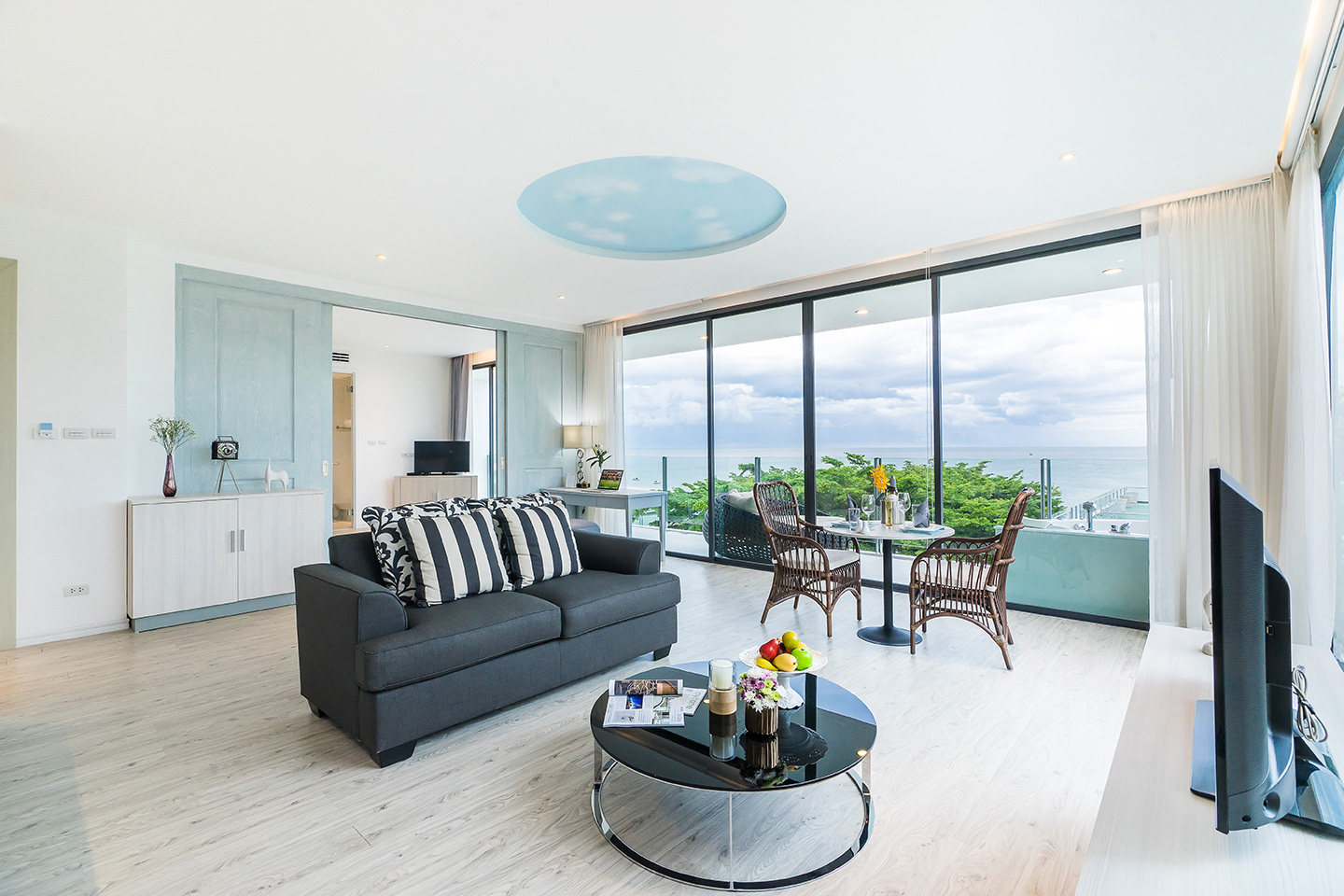 A large room area with 1 king size bed on the front sea view, terrace outdoor Jacuzzi facing ocean view and chair on the terrace.